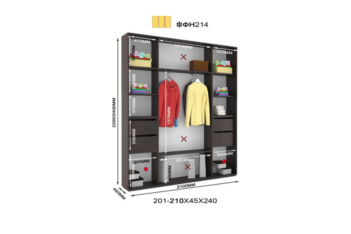 Цена указана за шкаф-купе шириной от 2010 мм до 2100 мм, который включает в себя зеркальные или ДСП фасады (на выбор), корпус, всё внутреннее наполнение, фурнитуру, а также комплектуется качественной алюминиевой раздвижной системой (профиль Элит серебро).