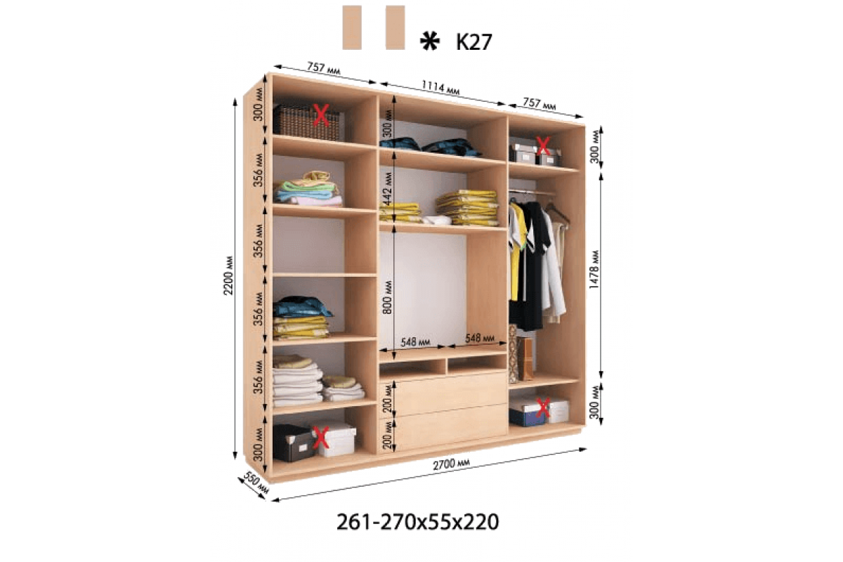 Цена указана за готовый шкаф-купе шириной 2700 мм, который включает в себя зеркальные или ДСП фасады (на выбор), корпус, всё внутреннее наполнение, фурнитуру, а также комплектуется качественной алюминиевой раздвижной системой (профиль серебро).