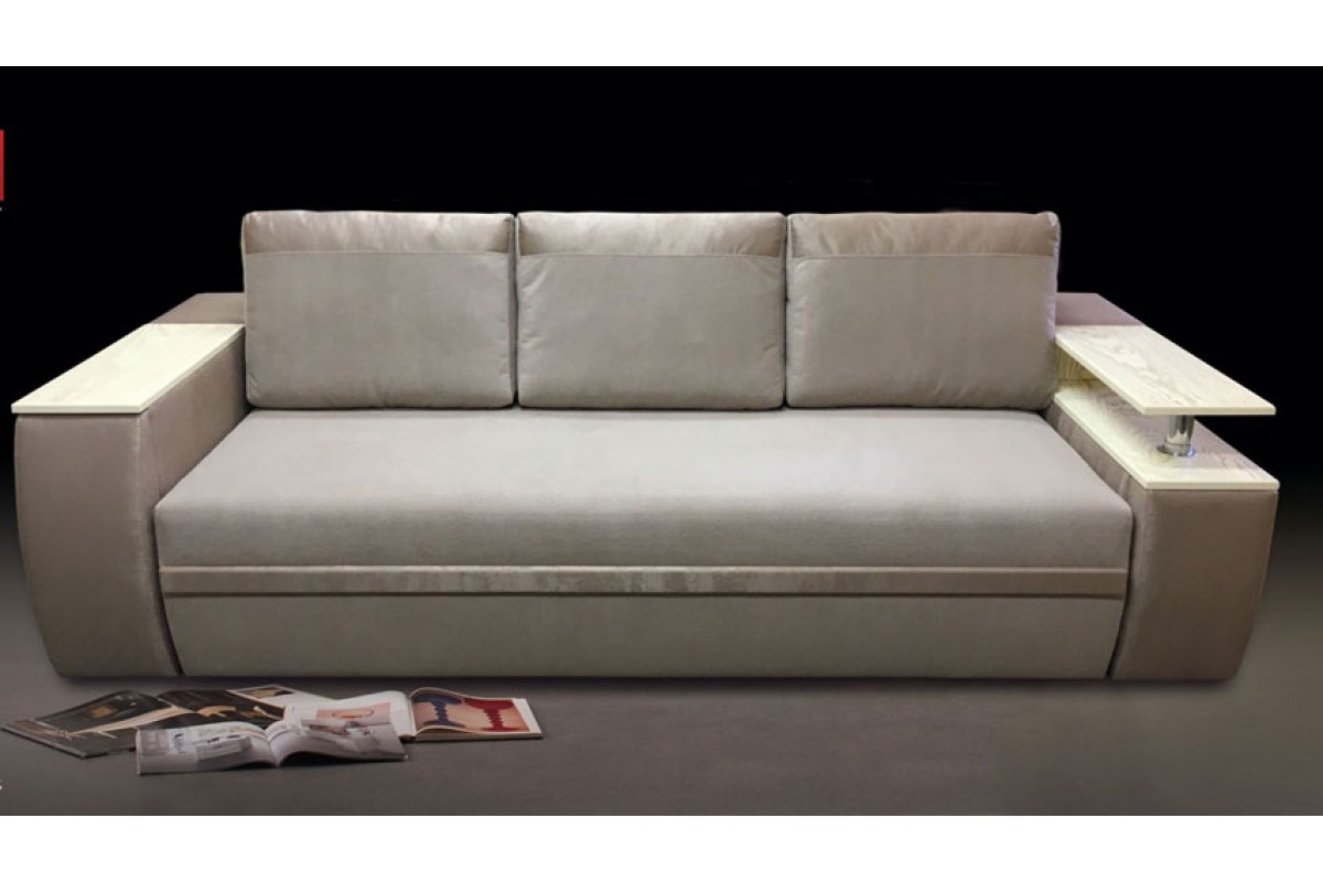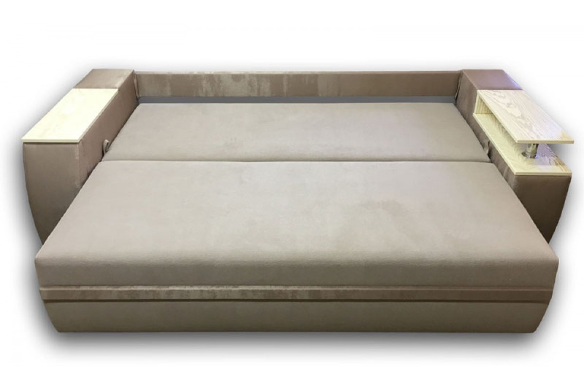Диван оборудован нишей для хранения постельного белья, нишей в одном подлокотнике и выдвижным баром в другом. Сами подлокотники