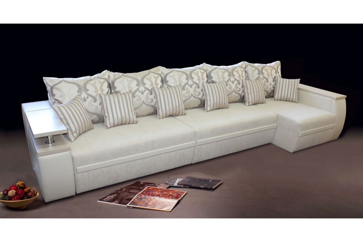Диван достаточно габаритный. Его размеры - 2700х1700х950. На нем свободно могут разместиться три взрослых человека. По желанию, в