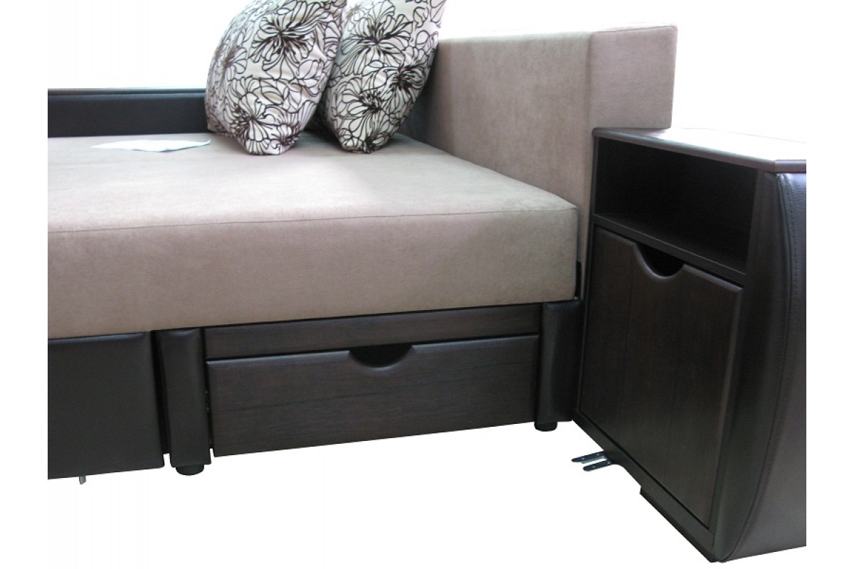 Общие моменты: Под сидением расположен контейнер для постельного белья из ламинированного ДСП, низ – белое ДВП. В разложенном состоянии имеется задняя спинка. По желанию заказчика угол комплектуется раскладывающимся креслом.