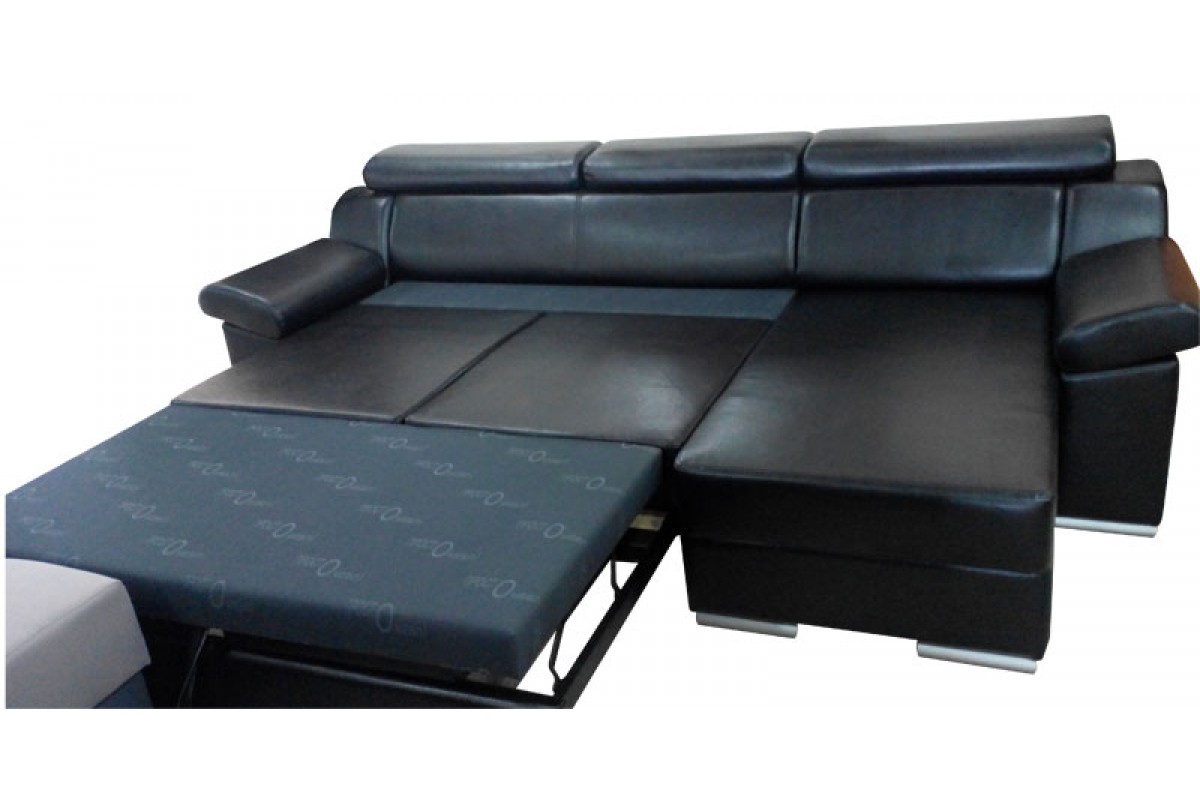 Тип раскладки: Выкатной тройной, раскладывается в три этапа: под спальным местом передняя часть на колесиках выдвигается вперед и приподнимается вверх - по типу раскладки Дельфин, потом дополнительно выдвигается вперед, изголовье может опускатся и подниматся вверх, фиксируется в нескольких положениях. Со стороны угла расположен подъемный механиз Аллигатор, под ним ниша для белья, стенки которого выполнены из белого ламинированного ДСП. На подъемном механизме для легкости открытия установлены два газовых амортизатора.