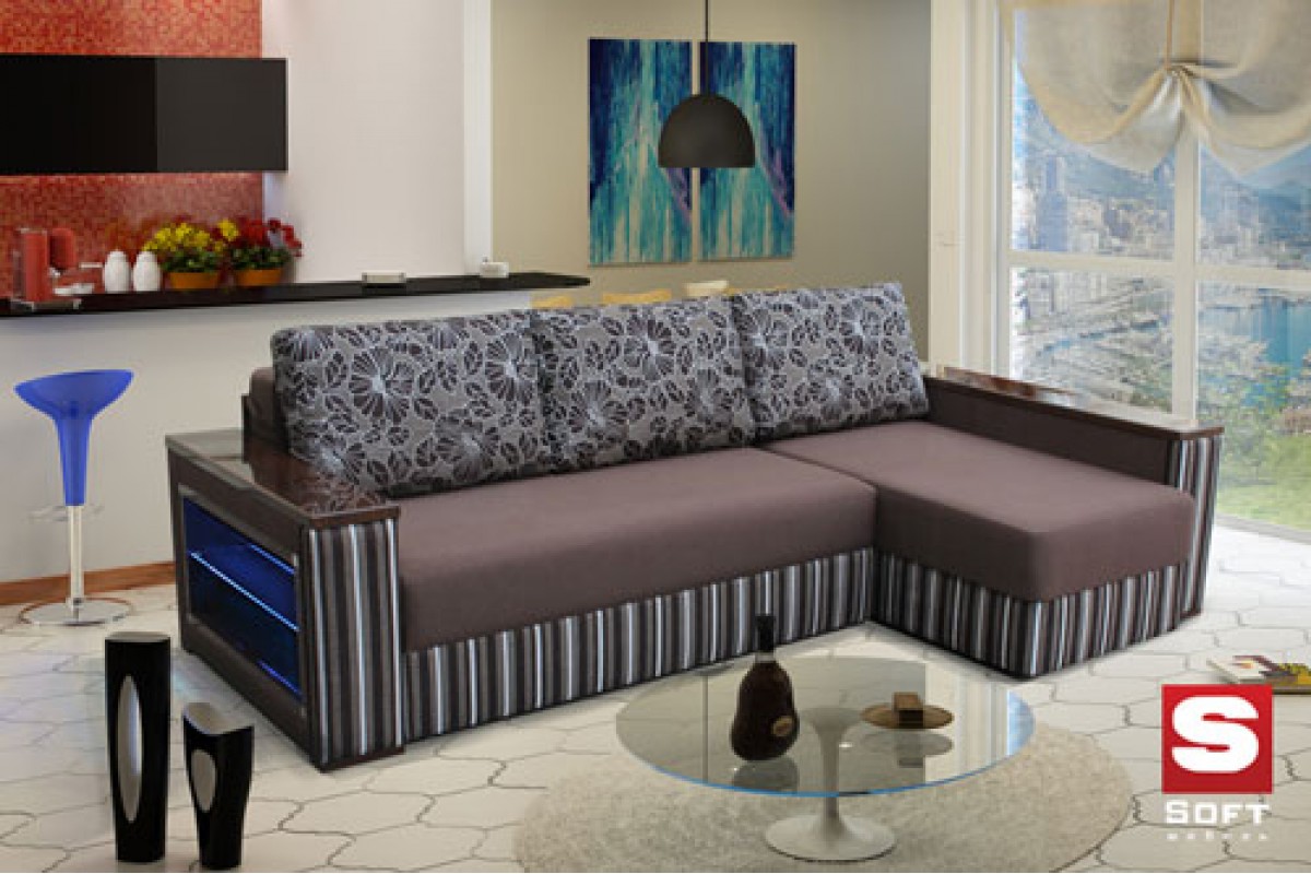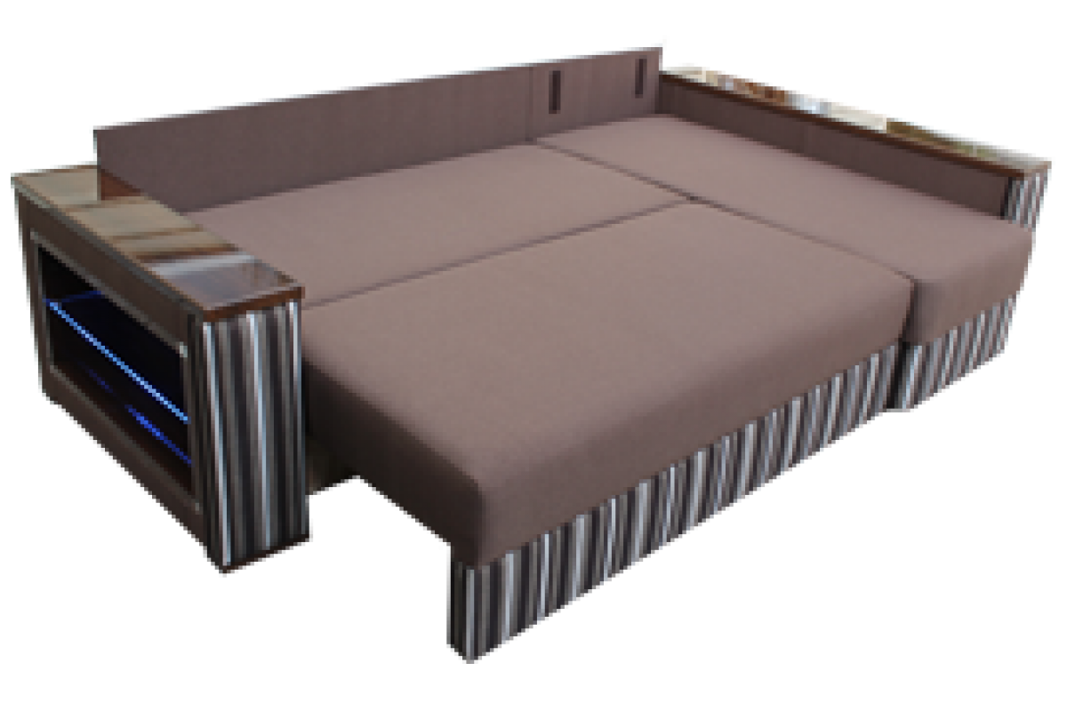 Подлокотники и полка из ламинированного материала позволяют ставить на него как предметы интерьера так и горячие напитки. Сделан на основе пружинных блоков,имеет очень большую и удобную спальную часть. Так же он оснащен двумя нишами для белья в диване и кушетке.